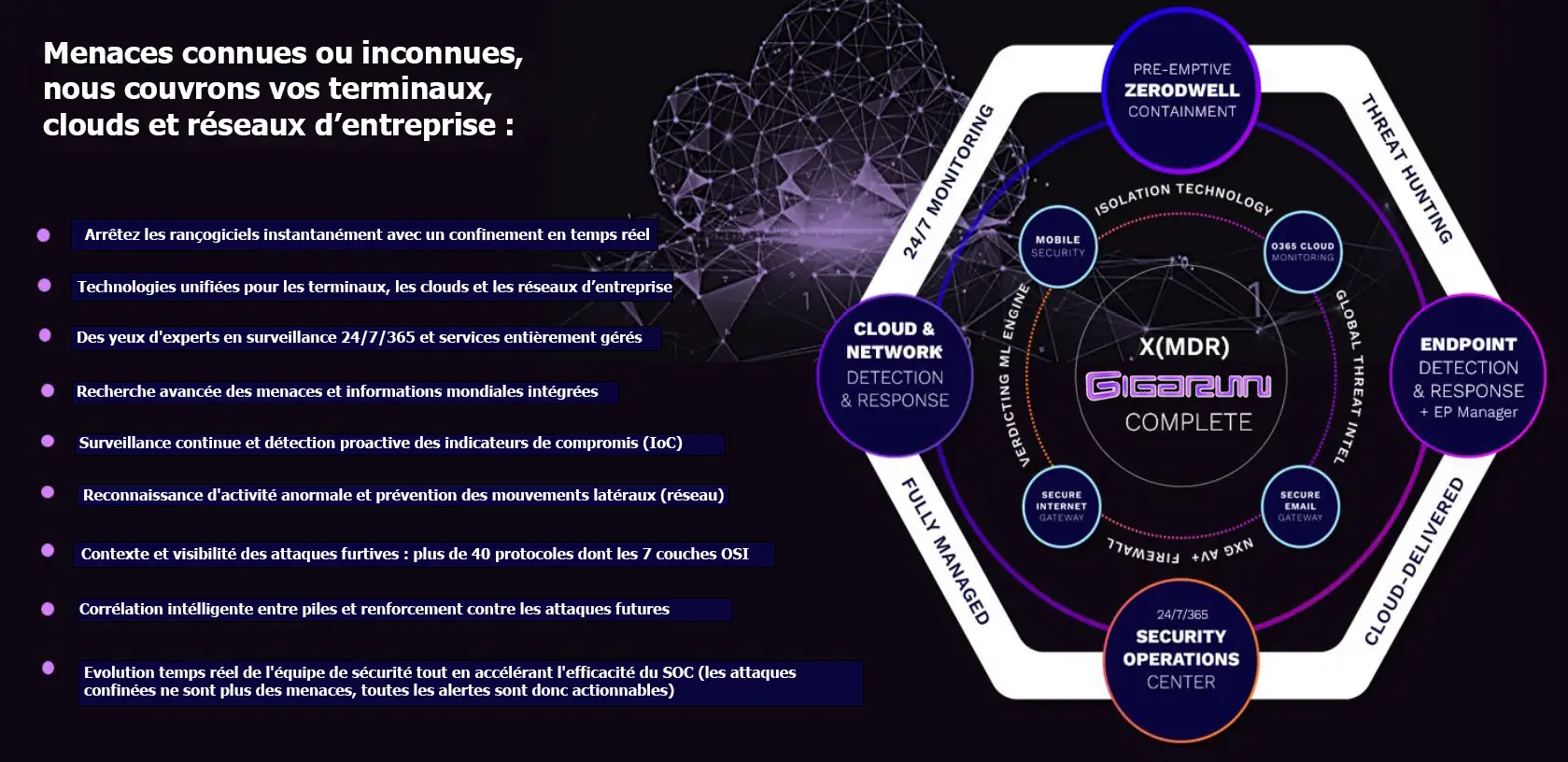 Un antivirus de pointe plus une plateforme de protection alimentée par l’IA pour détecter et bloquer les menaces en temps réel, incluant la surveillance des équipements, postes et mobiles 24/7.